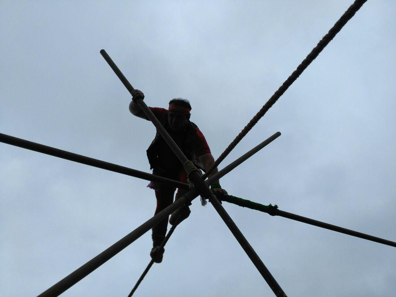 اصلیترین فرد نمایش «پهلوان» نام دارد که روی طنابها با پای برهنه راه میرود و برای تعادل خود چوب بزرگی به نام «لنگر» در دست میگیرد و گاهی پهلوان با ایستادن داخل تشت و یا قابلمه یا دوچرخهای که لاستیک ندارد، روی طناب راه میرود و نمایش اجرا میکند و هر قدر تسلط پهلوان بر طناب بیشتر و عملیات او متنوعتر باشد محبوبیتش نیز افزایش مییابد.