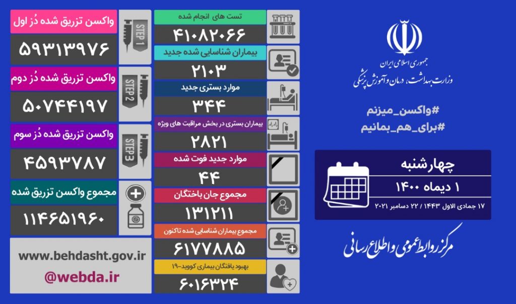 به گزارش کاشف اسرار به نقل از وبدا، در این اطلاعیه آمده است:تا کنون ۵۹ میلیون و ۳۱۳ هزار و ۹۷۶ نفر دُز اول، ۵۰ میلیون و ۷۴۴ هزار و ۱۹۷ نفر دُز دوم و چهار میلیون و ۵۹۳ هزار و ۷۸۷ نفر، دُز سوم واکسن کرونا را تزریق کرده اند و مجموع واکسن های تزریق شده در کشور به ۱۱۴ میلیون و ۶۵۱ هزار و ۹۶۰ دُز رسید.