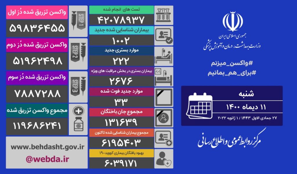 به گزارش پایگاه خبری ” کاشف اسرار ” به نقل از وبدا، در این اطلاعیه آمده است:تا کنون ۵۹ میلیون و ۸۳۶ هزار و ۴۵۵ نفر دُز اول، ۵۱ میلیون و ۹۶۲ هزار و ۴۹۸ نفر دُز دوم و ۷ میلیون و ۸۸۷ هزار و ۲۸۸ نفر، دُز سوم واکسن کرونا را تزریق کرده اند و مجموع واکسن های تزریق شده در کشور به ۱۱۹ میلیون و ۶۸۶ هزار و ۲۴۱ دُز رسید.