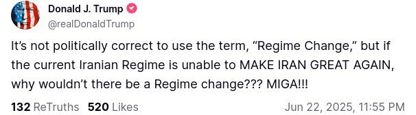 دونالد ترامپ ” با انتشار پیامی ، نوشت : از نظر سیاسی درست نیست که از اصطلاح «تغییر رژیم» استفاده کنیم، اما اگر رژیم فعلی ایران قادر نیست دوباره ایران را با عظمت کند، چرا نباید تغییر رژیم صورت بگیرد؟