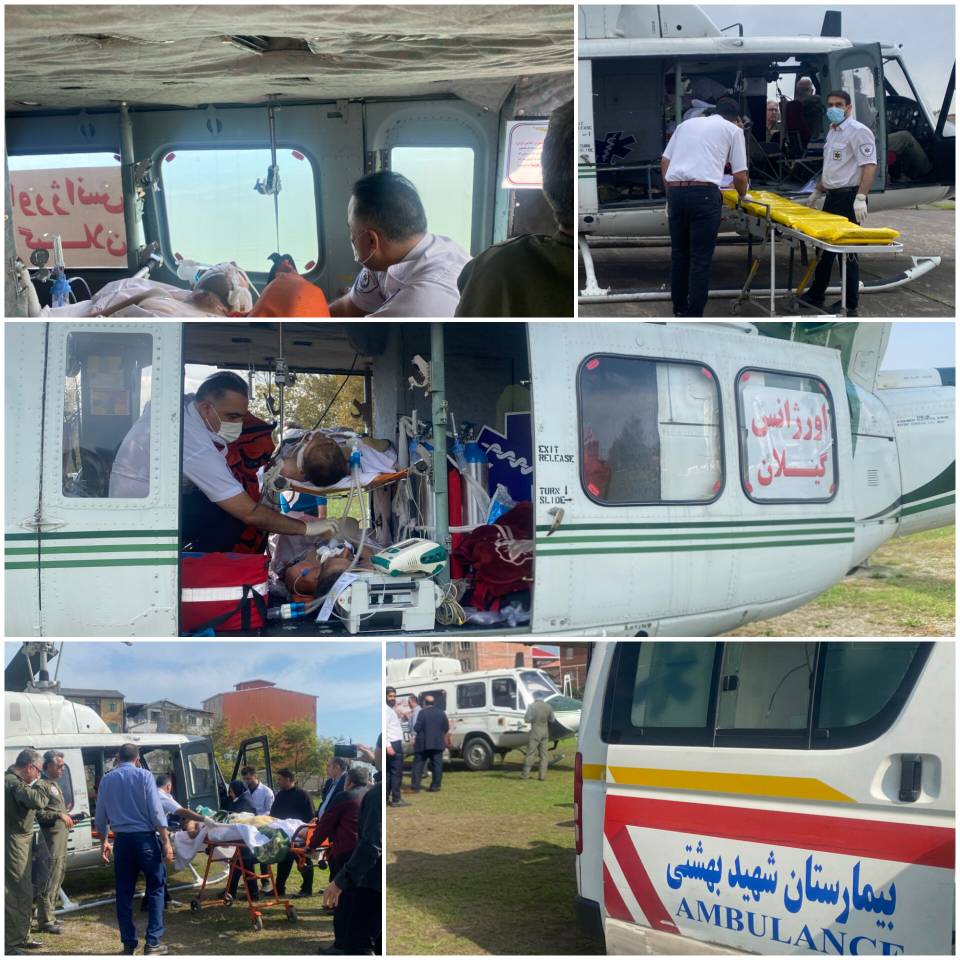 🚁با توجه به وخامت حال دو تن از مصدومان، در ساعت ۱۱:۴۴ با هماهنگی انجامشده، یک سورتی پرواز اورژانس هوایی گیلان برای انتقال فوری آنان انجام شد. این دو مصدوم از بیمارستان شهید بهشتی آستارا به فرودگاه رشت منتقل و سپس توسط دو دستگاه آمبولانس اورژانس ۱۱۵ به بیمارستان تخصصی ولایت شهر رشت انتقال یافتند.