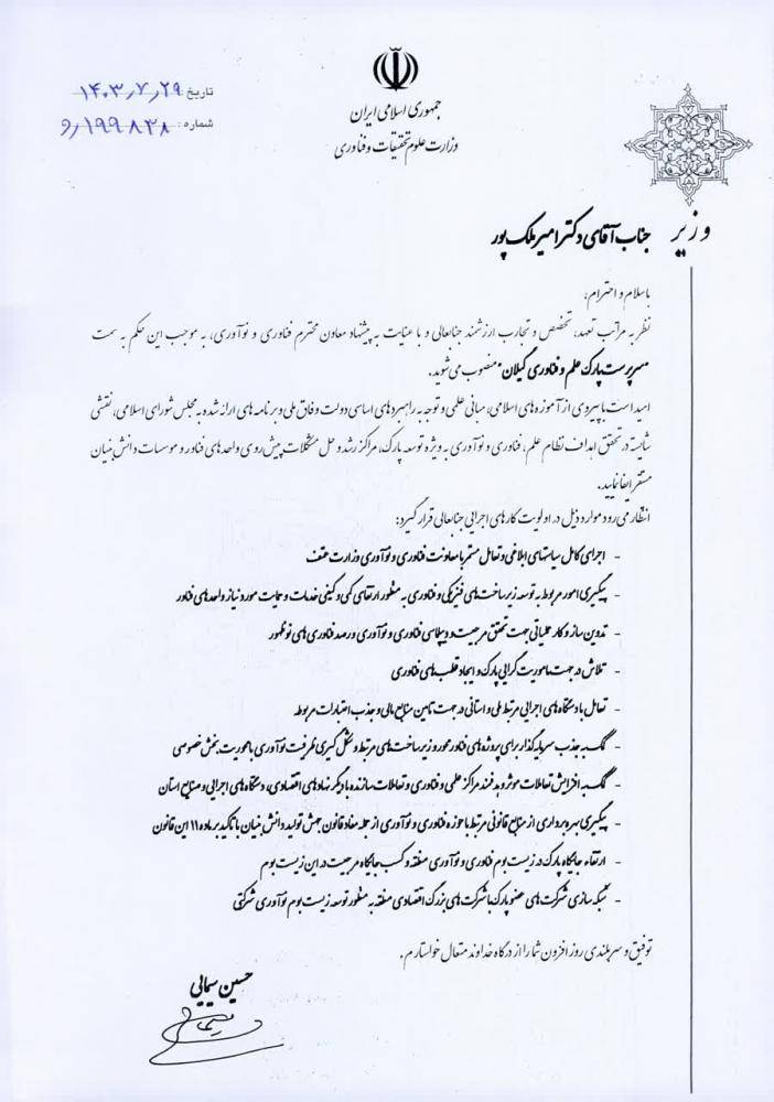 آیا زمان آن نرسیده که استاندار گیلان، به وضعیت بلاتکلیف سرپرست پارک علم و فناوری استان، “مهر پایان” بزند؟ آیا نباید با عزمی جدی، یا راه برای همکاری و تبدیل وضعیت ” ملک پور “که در اخبار منتشر شده در پرتال پارک خود را به صورت خود خوانده ” رییس ” می داند ،گشوده شود، با هماهنگی وزیر علوم، ” فردی به عنوان رییس برای هدایت این نهاد حیاتی تعیین گردد؟