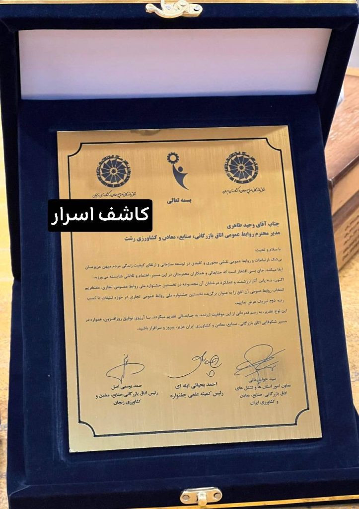 لوح تقدیر روابط عمومی اتاق گیلان توسط سید جواد زمانی، احمد یحیایی ایلهای رئیس کمیته علمی جشنواره، و صمد یوسفیاصل رئیس اتاق بازرگانی زنجان امضا و تقدیم شد ، بهعنوان گامی نمادین در تجلیل از روابط عمومیهای فعال کشور و الگویی برای توسعه ارتباطات تجاری و رسانهای در بخش خصوصی.