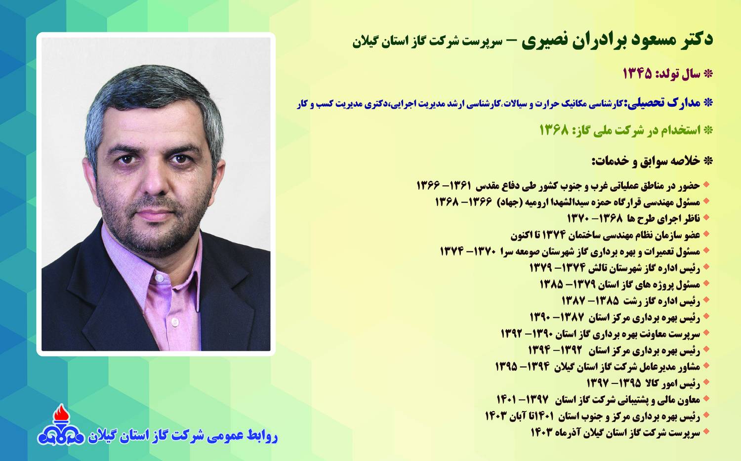 هم اکنون ” مسعود برادران نصیری ” به عنوان ” سرپرست یا مدیر عامل شرکت گاز گیلان ” فعالیت دارد با جستجو ” نام و خانوادگی و کد ملی ” در نوار جستجو گر اینترنت به فعالیت در ” شرکت راه سازی و پل سازی زمین همواران گیل صنعت ” یا در متن آگهی “ نیرو گستر كاسپین شمال صومعه (مسئولیت محدود) – شناسه ملی 14004150061 ” به عنوان ” رییس هیات مدیره ” از هجدهم خرداد ماه 1393 شمسی عضویت دارد و در ” شرکت مسیل سازه پارس (سهامی خاص – 16 مرداد 1387) با سمت ” عضو هیات مدیره ” به چشم می خورد.
